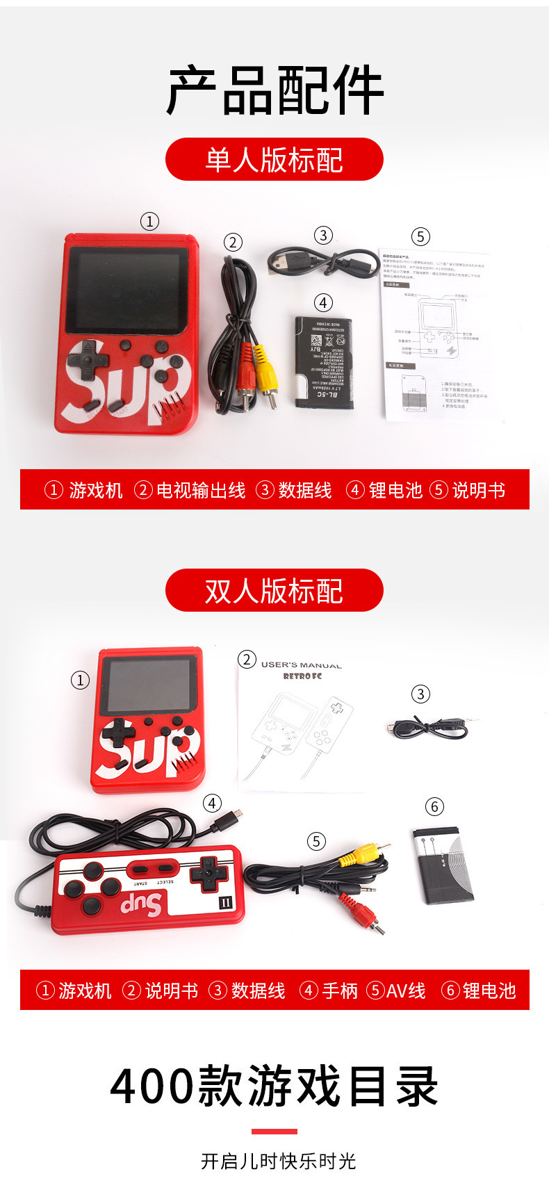 产品配置:包装+说明书+主机+电池+充电线+AV线(双人配一个手柄)